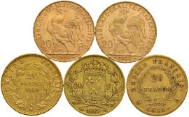 FRANCIA. CINQUE MONETE DA 20 FRANCHI
