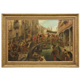 Lodovico Raymond, pittore piemontese, fu grande appassionato di storia, letteratura antica e medioevale; da esse trasse molto spesso i soggetti per la sua produzione pittorica, come nel caso dell’opera che presentiamo in questa vendita. L’artista frequentò spesso Venezia e lì trasse ispirazione per la sua famosa opera Le fioraie veneziane nel dì della Festa delle Marie, esposta alla Promotrice di Torino del 1868, di cui pubblichiamo una riproduzione. Mentre in quest’ultima l’attenzione è rivolta alle giovani fioraie in gondola che accolgono la processione delle Marie, nella nostra opera viene illustrata con precisione e dovizia di particolari la processione dei promessi sposi che con i musici, religiosi e notabili si snoda festosa attraverso i canali della città lagunare.