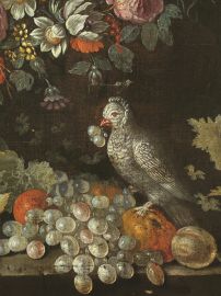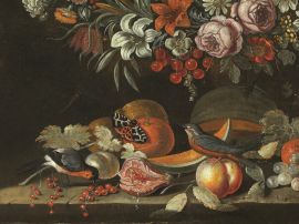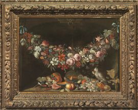 NATURA MORTA CON GHIRLANDA DI FIORI, FRUTTA E VOLATILI