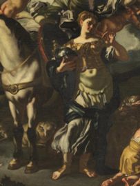 Il soggetto tassesco che racconta della sosta di Erminia, principessa musulmana, presso un villaggio di pastori, per allontanarsi dai fragori della guerra e dalle pene causate da un amore non corrisposto per il cavaliere cristiano Tancredi, è stato più volte raffigurato in pittura tra Sei e Settecento anche in ambito napoletano. Secondo De Dominici, Francesco Solimena (Canale di Serino, 1657 – Napoli, 1747) rappresenta l’episodio almeno in tre versioni, poi più volte replicate: il dipinto offerto si mostra assai affine dal punto di vista compositivo, ma anche da quello stilistico, alla versione in cui Solimena inserisce in alto la personificazione della Costanza, identificata da Nicola Spinosa con una tela in collezione privata (cfr. N. Spinosa, Francesco Solimena (1657-1747) e le arti a Napoli, Roma 2018, pp. 435 – 437, cat. 190).