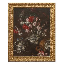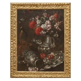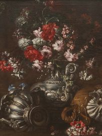 Sono qui riprese soluzioni già esplorate dagli specialisti nel genere coevi al pittore o appena più anziani, da Nicola Malinconico a Gaspare Lopes, non senza richiami all’ultimo Giuseppe Recco: dai loro esempi, per l’appunto, la scelta di accompagnare i fiori con vasi in argento e di disporre la composizione all’aperto, quasi a simulare l’allestimento di un rinfresco in giardino. Soluzioni già maturate, peraltro, nell’ambiente romano dopo la metà del secolo e diffuse a Napoli da chi appunto a Roma si era formato, come Abraham Brueghel e lo stesso Paolo Porpora.