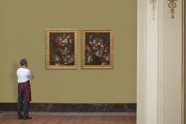 Sontuosi ma raffinati negli accordi cromatici che esplorano l’intera gamma dei rossi e del rosa, e nella splendida “mostra” di vasellame in argento dalle costolature lucenti alternate a campi incisi di chiaroscuro, i dipinti qui presentati costituiscono una splendida prova della creatività di Andrea Belvedere, appena prima della conclusione della stagione più felice della natura morta napoletana.