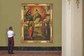 Anteriore a questa data, e certamente situato nei primi anni Venti, il soggiorno nella Città Eterna che gli valse l’appellativo di “Romano”: da un incontro con il classicismo raffaellesco deriva appunto l’ampiezza delle austere figure togate dei santi nel registro inferiore della nostra tavola e, più specificamente, la triade in quello superiore, palesemente ispirata al gruppo corrispondente nella Disputa del Sacramento.