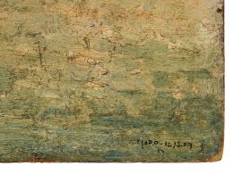 L’anno che sembra leggersi sul dipinto di Chioggia di fianco alla firma parrebbe essere 1873, tuttavia, se a quell’epoca la sua produzione mostra già diversi esempi di opere cariche di luce, lo stile rimanda a una datazione più tarda, risalente all’attività più matura dell’artista, caratterizzata da una pennellata franta e vaporosa. Nella catalogazione generale dei dipinti di Ciardi, l’autore Nico Stringa pubblica il nostro quadro riportando la datazione al 1907, sicuramente più pertinente.