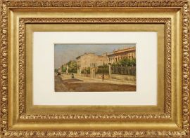 Nato a Pisa ma formatosi a Firenze all’Accademia di Belle Arti di Firenze, Odoardo Borrani fu tra i membri principali della corrente artistica dei Macchiaioli, sviluppatasi alla metà degli anni Cinquanta dell’Ottocento nel capoluogo toscano. Con Telemaco Signorini, Vincenzo Cabianca e Raffaello Sernesi, a cui era legato da un forte rapporto d’amicizia, condivise, oltre alla frequentazione del Caffè Michelangelo di via Larga, punto d’incontro degli artisti macchiaioli, le ricerche pittoriche all’aria aperta. Borrani ritrae le campagne ma anche la città da mille angoli diversi, documentandone la parte antica, i palazzi storici e le nuove e più recenti aggiunte, come testimonia la preziosa tavoletta che presentiamo in questo catalogo.