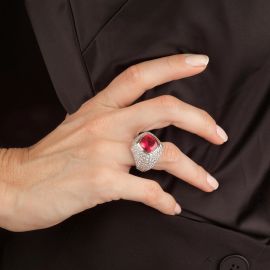 in oro bianco 18kt, impreziosito al centro da una tormalina taglio cuscino di ct 5.60 circa, circondata da pavé di diamanti taglio brillante per ct 4.30 circa, punzoni 750 e del fabbricante, mis. 55, gr. 23