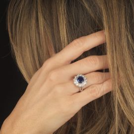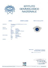 in oro bianco 18kt, al centro uno zaffiro birmano taglio rotondo di ct 2.50 circa, circondato da diamanti taglio brillante per ct 0.60 circa, colore G/H, purezza IF/Vvs, punzone 750, mis. 56, gr. 7. Corredato di certificato IGN del 19/02/2020 attestante le caratteristiche, l'origine geografica e l'assenza di trattamenti termici.