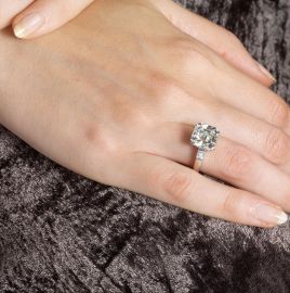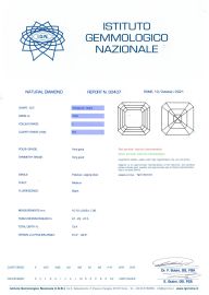 in platino, con al centro un diamante taglio ottagonale di ct 5.68 (smontato), colore L, purezza SI1, affiancato da due diamanti taglio baguette per ct 0.30 circa, punzone PT, mis. 56, gr. 4. Corredato di certificato IGN del 12/10/2021 attestante le caratteristiche.