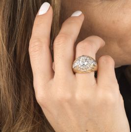 in oro giallo e bianco 18kt, al centro un diamante taglio vecchio di ct 1.60 circa, circondato da diamanti taglio vecchio e huit huit per ct 1.30 circa, mis. 58, gr. 12