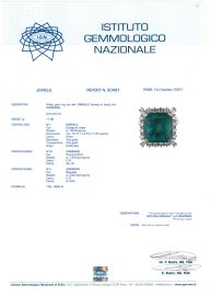 in oro bianco 18kt, al centro uno smeraldo taglio ottagonale di ct 18.20 circa, circondato da una fila di diamanti taglio brillante per ct 0.60 circa, colore F/G, purezza Vs/SI e diamanti taglio baguette per ct 0.60 circa, colore F/G, purezza IF/Vvs, punzoni 750 e del fabbricante, mis. 57, gr. 18. Corredato di certificato IGN del 18/10/2021 attestante le caratteristiche e l'origine geografica della pietra.