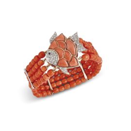 composto da quattro fili di barilotti in corallo di mm 5x4 circa, distanziali e fermatura a forma di pesce in oro 14kt, impreziosito da diamanti taglio brillante per ct 1 circa, punzone 585, lungh. cm 19, gr. 54