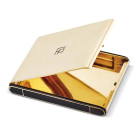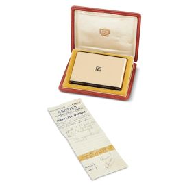 in oro giallo 18kt con bordatura in smalto nero, firmato "Cartier Paris", punzoni francesi, coperchio con iniziali "FP." in smalto nero, dim. cm 9,5x7x1, gr. 147. Corredata di scatola e certificato di acquisto.