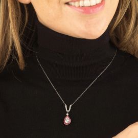 piccola catena in oro bianco 18kt, da cui pende un ciondolo in oro bianco e giallo 18kt impreziosito da un diamante taglio a goccia di ct 1.20 circa, diamanti taglio vecchio per ct 0.30 circa e rubini per ct 0.40 circa, dim. pendente cm 1x3 circa, lungh. cm 45, chiusura a moschettone, gr. 5