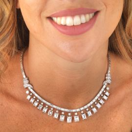 in oro bianco 18kt, composto da una fila diamanti taglio baguette per ct 17 circa, da cui pendono diciassette diamanti taglio smeraldo per ct 21 circa, ciascuno sormontato da un diamante taglio brillante per ct 1.70 circa e cinti all'estremità da due elementi a voluta decorati con diamanti taglio brillante per ct 2 circa, diam. interno cm 12,5x11, lungh. cm 40, gr. 69