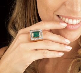 in oro giallo e bianco 18kt inciso, di forma geometrica con al centro uno smeraldo taglio ottagonale di ct 6.50 circa, circondato da una fila di diamanti taglio brillante per ct 2.20 circa, punzone 18kt, mis. 65, gr. 34