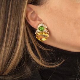 in oro giallo 18kt, impreziositi da quarzi verdi e citrini sfaccettati e da diamanti taglio brillante per ct 0.80 circa, punzone 750, dim. cm 2,5x3,5, chiusura a clip, gr. 37 complessivi