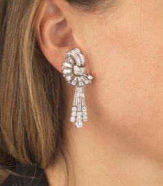 in oro bianco 18kt, composti da elementi centrali a voluta da cui pendono parti amovibili impreziosite da diamanti taglio brillante, baguette e huit huit per ct 8 circa, dim. cm 1,5x5, lungh. cm 5, gr. 30 complessivi