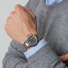 cassa in acciaio, fondello serrato con viti, lunetta liscia in acciaio, copricorona avvitato con catena, quadrante nero, grafica bianca, numeri arabi al trizio, datario tra ore quattro e cinque, movimento a carica automatica, bracciale a maglie piatte in acciaio satinato, chiusura doppia deployant a scomparsa, vetro minerale. Diam. mm 35
