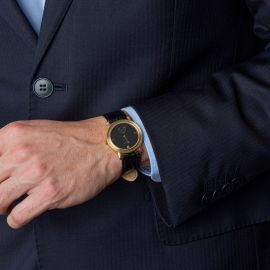 cassa rotonda in oro giallo 18kt, fondello con movimento a vista, lunetta scanalata in oro giallo 18kt, quadrante nero, grafica oro, numeri romani applicati, secondi a ore sei, movimento a carica manuale cal. 7001 su base ETA, cinturino in pelle, fibbia in metallo dorato, gr. complessivi 35. Diam. mm 32