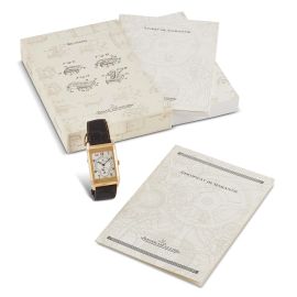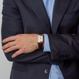 cassa basculante rettangolare in oro rosa 18kt, corona marcata, quadrante argentè con sfere bianche al centro, numeri arabi, secondi a ore sei, grande data a ore undici, sfera del mese al centro del quadrante, movimento a carica manuale, cinturino in pelle con fibbia deployant originale in oro rosa 18kt, vetro minerale, gr. complessivi 86. Corredato di garanzia. Dim. mm. 36x26
