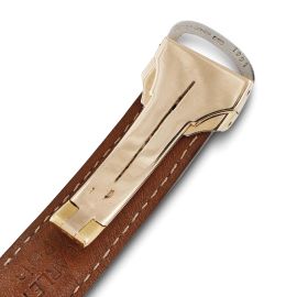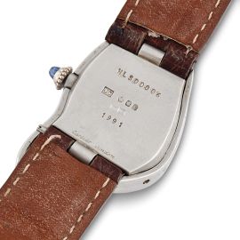 cassa di forma asimmetrica in platino riportante i marchi Inglesi relativi alla produzione 1991 in platino, marchio JC e firma Cartier London, quadrante con numeri romani dipinti, movimento a carica manuale Le Coultre cal K840, fibbia deployant asimmetrica in oro 18kt firmata e numerata. Dim. mm 13x43