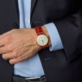 cassa in oro rosa 18kt, fondello a scatto, quadrante panna ristampato, grafica nera, indici applicati di colore oro, contatore dei secondi a ore nove, contatore dei minuti a ore tre, scala tachimetrica e telemetrica, movimento a carica manuale, cinturino in pelle, fibbia in acciaio non originale, vetro plastica. Diam. mm 33