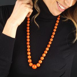ad un filo di barilotti digradanti da mm 19x17 a mm 9x8 circa, fermatura in oro giallo 18kt, punzone 750, lungh. cm 76, gr. 142