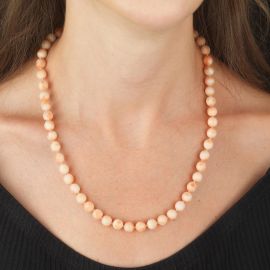 ad un filo di sfere in corallo rosa di mm 7 circa, fermatura in oro giallo 18kt, punzone 750, lungh. cm 50, gr. 38