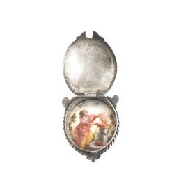 un ciondolo in argento, apribile e recante all'interno una miniatura in smalto raffigurante una giovane donna, punzone del fabbricante, dim. cm 2x4 circa, gr. 7, accompagnato da un pendente con medaglia in oro giallo 18kt, raffigurante "S. Giorgio che sconfigge il drago", punzone 750 e del fabbricante, dim. cm 2x3 circa, gr. 6