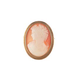 spilla/pendente in oro 18kt con cammeo in conchiglia, dim. cm 4,5x3, gr. 13, accompagnata da un anello in argento con cammeo in conchiglia, mis. 58, gr. 4