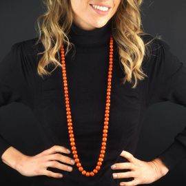 ad un filo di barilotti lievemente sfaccettati e leggermente digradanti da mm 11x11 a mm 7x7 circa, fermatura in oro a basso titolo e smalti, lungh. cm 102,5, gr. 154