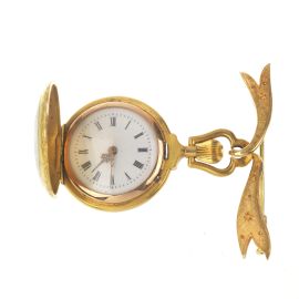 18KT YELLOW GOLD BROOCH WITH A SMALL POCKET WATCH IN 14KT GOLD