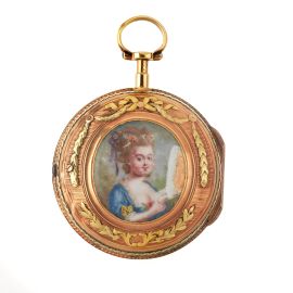 cassa in oro a basso titolo, controcassa in oro a basso titolo decorata con motivi floreali, lunetta impreziosita da piccole rose di diamante, fondello con raffigurazione di dama in smalti, quadrante in porcellana, numeri romani e arabi, movimento a carica manuale, gr. complessivi 78. Diam. mm 43