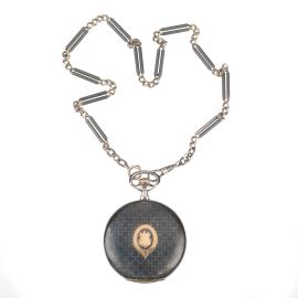cassa in argento in tre parti decorata a niello con stemma, punzone svizzero, catena in argento decorata a niello, lungh. complessiva cm 47, punzone inglese e del fabbricante, quadrante bianco, secondi a ore sei, numeri arabi, lancette a foglia, movimento a carica manuale n. I755736, vetro plastica, gr. complessivi 112. Diam. mm 50