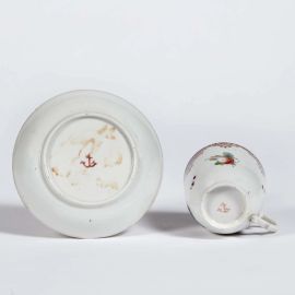 in porcellana, tazzina di forma a campana con ansa ad orecchio mistilinea piattino rotondo su piede ad anello. Decoro a piccoli frutti policromi e bordo orlato da motivo “a squama porpora” impreziosito da rocaille in oro. Marca ancora rossa; tazzina alt. cm 7, piattino diam. cm 12,5