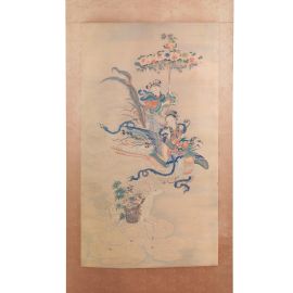su carta, raffigurante figure femminili con fenice e cerbiatto; cm 51,5x95