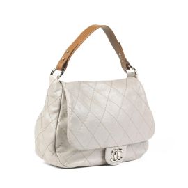 In pelle trapuntata beige/grigio chiaro, con tracolla regolabile in pelle color cuoio. Logo in metallo color argento come chiusura frontale. Fodera color champagne. Dotata di carta identificativa e dust-bag originale.