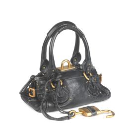 In morbida e super resistente pelle nera, piccola borsa con doppio manico e lucchetto come peso di chiusura in metallo color ottone invecchiato, come le zip con doppio cursore e gli altri piccoli dettagli in metallo, incluso la chiavetta attaccata come charm.