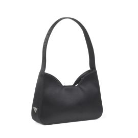 In raso nero, borsetta semirigida con tracolla corta e raffinato logo in metallo e smalto sul fianco per un “vedo-non-vedo” quando indossata a spalla.