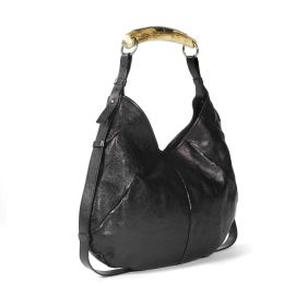 In pelle invecchiata nera effetto traslucido bronzato, con tracolla in corno e rivestimento argento. Fodera in camoscio e una tasca interna con zip. Corredata di dust bag originale.