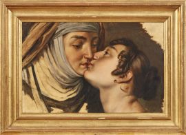 In realtà, la mancata idealizzazione delle fattezze della modella effigiata è una scelta voluta dell’autore che descrive particolari di inconsueto naturalismo presenti anche in altre due versioni coeve al celebre quadro, una delle quali oggi presentata, raffiguranti il bacio di Giulietta alla sua nutrice. La giovane, ritratta in primo piano nella stessa posizione e con simile espressione dell’Ultimo bacio dato da Giulietta a Romeo, si avvicina alla balia, toccandole il mento e allungando le labbra in un gesto di affetto e di intimità verso la donna che l’ha nutrita e allevata con un bacio rimasto a metà, come quello scambiato con l’amato. Mentre con Romeo, Giulietta si abbandona all’emozione chiudendo gli occhi, con la nutrice li tiene leggermente aperti.