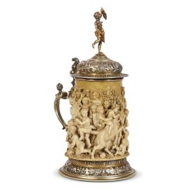 il corpo in avorio intagliato raffigurante scena di putti che danzano suonano e bevono, montatura in argento con punzone sul fondo, coperchio con bacchino, base con motivi a grottesche e cartouches con frutti, ansa in foggia di erma femminile, alt. cm 26