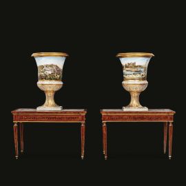 in porcellana dipinta in policromia e oro, di forma medicea con base quadrangolare ornata a piccoli cerchi incrociati su cui poggia il piede cilindrico decorato a baccellature, corpo interamente dipinto con grande veduta di Napoli sotteso da decoro a foglie sovrapposte e rivolte verso l'alto all'attacco con il piede, orlo estroflesso profilato in oro, alt. cm 100, diam. cm 68