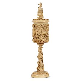in avorio, il corpo intagliato con scene di deità marine, poggiante su un alto fusto scolpito a delfino cavalcato da putti, coperchio con presa realizzata a tutto tondo a forma di tritone che sorge da bocciolo, alt. cm 45