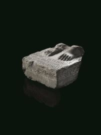 Base di statua in pietra dura, ascrivibile ad una figura stante. Su questa si conservano solo parte dei piedi, peraltro realizzati con particolare cura (si noti l’indicazione delle unghie nelle dita). Quasi integro è invece il lungo testo geroglifico che occupa il tratto superiore della base, il davanti ed i fianchi. 17,4 x 13 cm.
