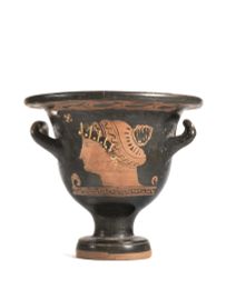 Piccolo cratere a campana, con orlo estroflesso, piede ad echino ed anse orizzontali a profilo sormontante. La decorazione figurata, a figure rosse, consiste sul lato A in una figura di giovane seduto, volto verso sinistra, con un'ampia phiale nella destra ed un grappolo d'uva nella sinistra. Nel campo figurato, il lato B è interamente occupato da una testa femminile volta a sinistra, tagliata alla base del collo con capelli raccolti in un elaborato kekryphalos sulla sommità del capo e decorati sulla fronte da un diadema sovraddipinto. La decorazione secondaria consiste in un tralcio di foglie d'olivo o di alloro sul rovescio dell'orlo, in una fascia a risparmio sull'orlo e sul battente del piede e in motivi a meandro corrente alla base delle scene figurate. H. 19,8 cm; diam. orlo 21,5 cm.