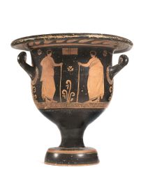 Grande cratere a campana con orlo svasato ingrossato, corpo campaniforme, stelo cilindrico, piede ad echino con una modanatura. Sopra il punto di massima espansione sono impostate due anse orizzontali a profilo sormontante. La decorazione figurata consiste sul lato A in una scena con un giovane nudo (Dioniso?) seduto con una phiale ed un tirso, verso cui si dirige un satiro con kantharos e cestello in mano. Osserva la scena una figura femminile appoggiata ad un pilastrino con un tamburo in mano ed un tirso nell'altra. Sopra queste tre figure è un erote androgino alato. Sul lato B sono due giovani ammantati appoggiati ad un bastone, ambientati in una scena di conversazione in palestra. Fra di loro un elemento vegetale. La decorazione secondaria consiste in una corona di foglie di alloro o olivo sotto l'orlo, un meandro alla base della decorazione figurata e in un elaborato motivo di palmette sotto le anse, a loro volta racchiuse da tacche verticali. H. 46,4 cm; diam. orlo 47,2 cm.