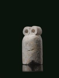 Idolo ad occhioni in alabastro scolpito, composto da un ampio corpo campaniforme sopra il quale campeggiano due occhi di grandi dimensioni resi da elementi cilindrici forati. H. 13,5 cm; largh. 8,1 cm; prof. 5,6 cm.