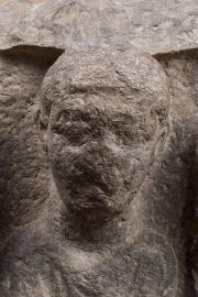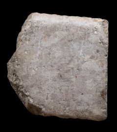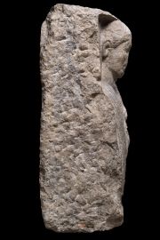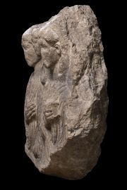 Grande rilievo in pietra calcarea che mostra una coppia con un bambino affacciata ad un elemento quadrangolare (cornice), conservato in particolare in corrispondenza del margine superiore e laterale sinistro. L’uomo, conservato quasi fino all’altezza della vita, è totalmente avvolto in un’ampia toga e regge con la mano sinistra, parzialmente nascosta dalla veste, un oggetto cilindrico (papiro ?), mentre porta la destra sul petto. La donna indossa anch’essa una lunga veste, mossa da numerose incisioni, un lembo della quale è sollevato sul capo: porta anch’essa la mano destra sul petto, mentre la destra, che doveva essere originariamente abbassata non è conservata. Fra i due adulti, in alto, si vede chiaramente un fanciullo, vestito con una tunica, e rappresentato mentre sfiora con la mano destra il gomito sinistro. La capigliatura, conservata solo in parte, presenta i capelli tirati all’indietro Sul suo petto si vede una bulla rilevata. 97 x 94 x 36 cm.