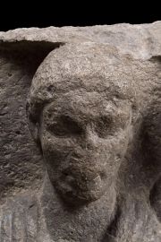 Questo rilievo è ascrivibile ad una categoria molto specifica di monumenti databile fra la tardissima età repubblicana, nel I secolo a.C. e la prima parte del I secolo d.C.: quella che raffigura i busti di intere famiglie come affacciati da profonde nicchie murate nei sepolcri antichi. In questo caso l’idea non è tanto quella di fissare alle pareti le immagini degli antenati, ma quella invece di rappresentare il monumento come una casa con nicchie e finestre, da cui si affacciano i membri delle famiglie del ceto medio, rappresentati in momenti di affetto reciproco e con tutti gli elementi utili a definire il loro status ed il loro rango (in questo specifico caso, ad esempio, la bulla del fanciullo e la toga ed il rotolo di papiro dell’uomo). Questo costume è ben riscontrabile non soltanto nella città di Roma (basti pensare a tal proposito ai monumenti rinvenuti lungo la via Statilia, ancora in situ, od ai rilievi ai Musei Vaticani o al Museo Nazionale Romano), ma anche in gran parte della penisola, dalla Campania alla Cisalpina (si veda a tal proposito i numerosi esempi presentati in H.G. Frenz, Römische Grabreliefs in Mittel-und Süditalien, Roma 1985). Fra le immagini in cui compaiono coppie con figlio al centro, possiamo ricordare il rilievo ai Musei Vaticani, (Galleria Lapidaria XV 80, inv. 9398; Arachne n. 20740). Per quanto riguarda l’aspetto, molto specifico, della capigliatura della figura femminile, nonostante l’usura è possibile riconoscere in esso l’elemento rilevato al centro della fronte che caratterizzata uno dei tipi iconografici della moglie di Augusto, l’imperatrice Livia (tipo Copenaghen 616, si noti in particolare la presenza dei due riccioli che ricadono sulle spalle, a differenza del vicino tipo Copenhagen 615). Un’acconciatura avvicinabile compare in un busto femminile ad altorilievo rinvenuto al sesto miglio della via Appia (Arachne n. 1087994) o nelle tre figure femminili in un celebre rilievo ai Museo Museo Gregoriano Profano ex Lateranense (inv. 10464; F. Sinn, Reliefs, Altäre, Urnen, Museo Gregoriano Profano ex Lateranense. Katalog der Skulpturen 1.1, Magonza 1991, pp. 30-31, n. 9).